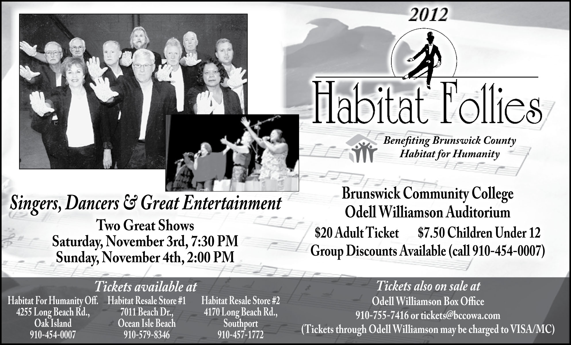 Thus, Brunswick County Habitat annually hosts its variety-show fund-raiser, Habitat Follies. This year, the follies will take place at Brunswick Community College’s Odell Williamson Auditorium on Saturday, Nov. 3rd at 7:30 p.m. and again on Sunday, Nov. 4th at 2 p.m.